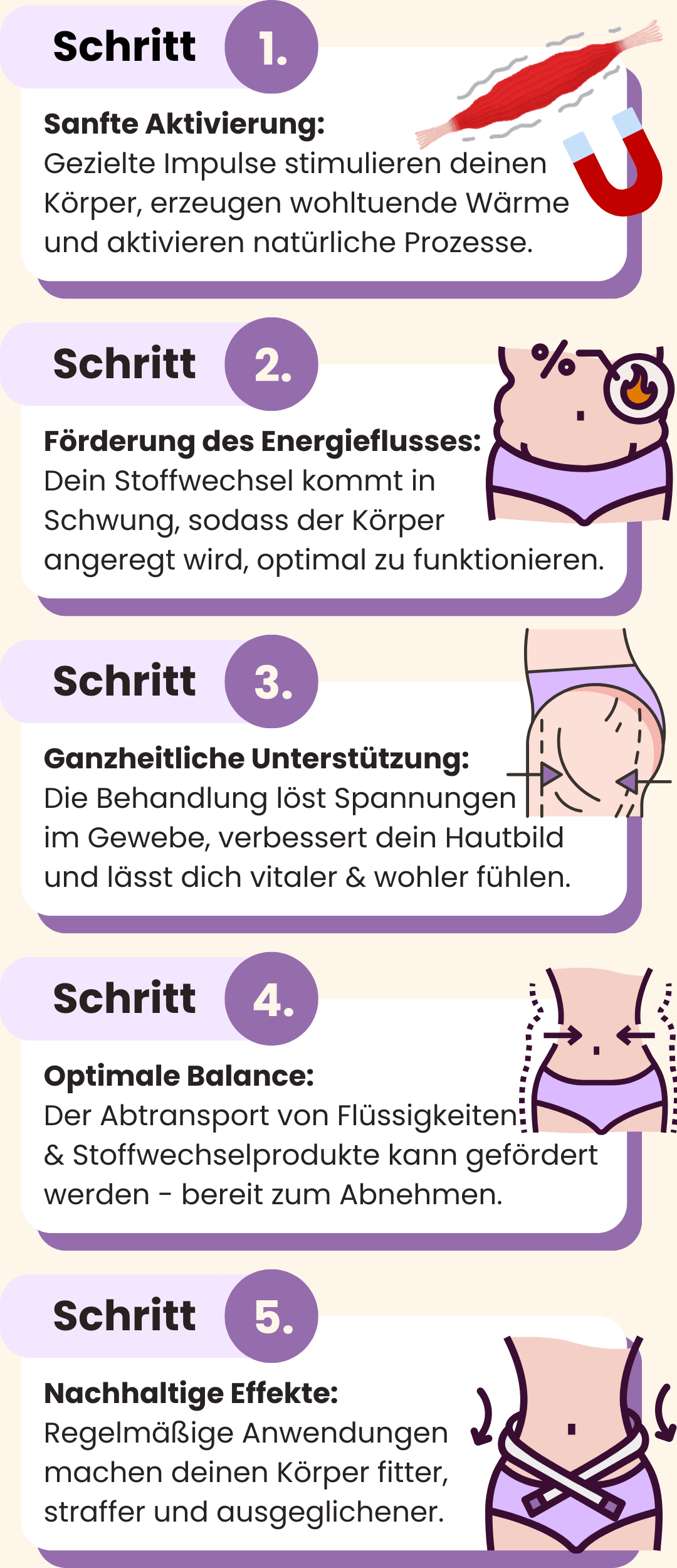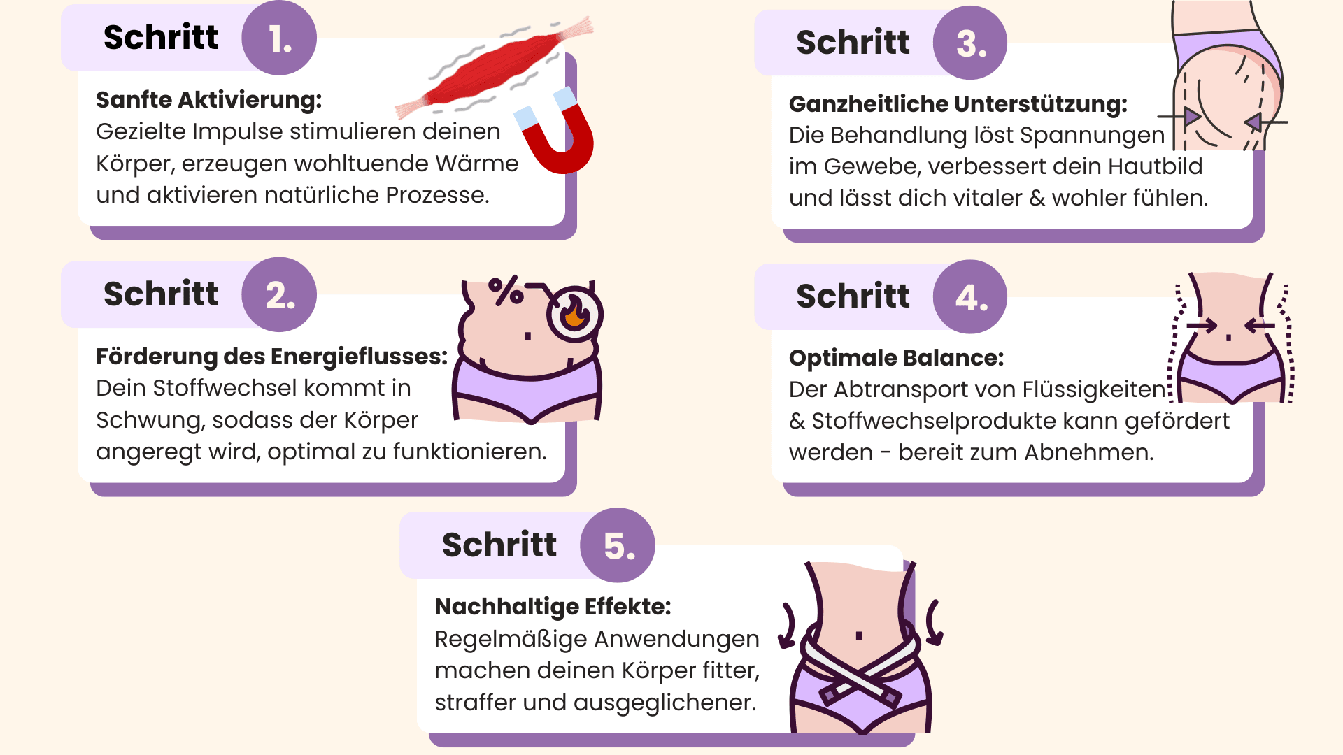 5 Schritten zu deiner Wohlfühlfigur. Alles, was du tun musst, ist dich auf eine unserer bequemen Liegen zu legen. Anschließend bringen